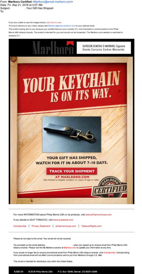 Email from Marlboro in September 2018 letting the recipient know that their free key chain, a promotion as part of the Marlboro Certified sweepstakes, it in the mail, providing a link to track the shipment.