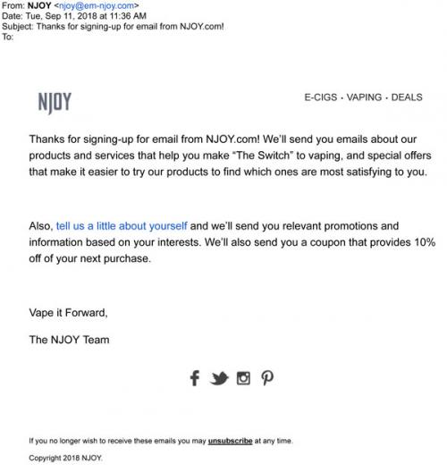 Email from NJOY in September 2018 thanking the recipient for signing up for brand notifications via email. Asks for more personal information in order to receive a coupon and relevant promotions in the future.