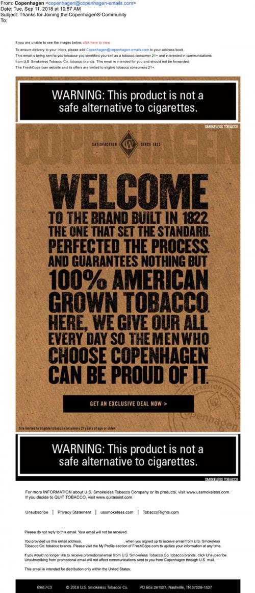 Email from Copenhagen in September 2018 thanking the recipient for joining the brand website, with a link to claim a coupon.