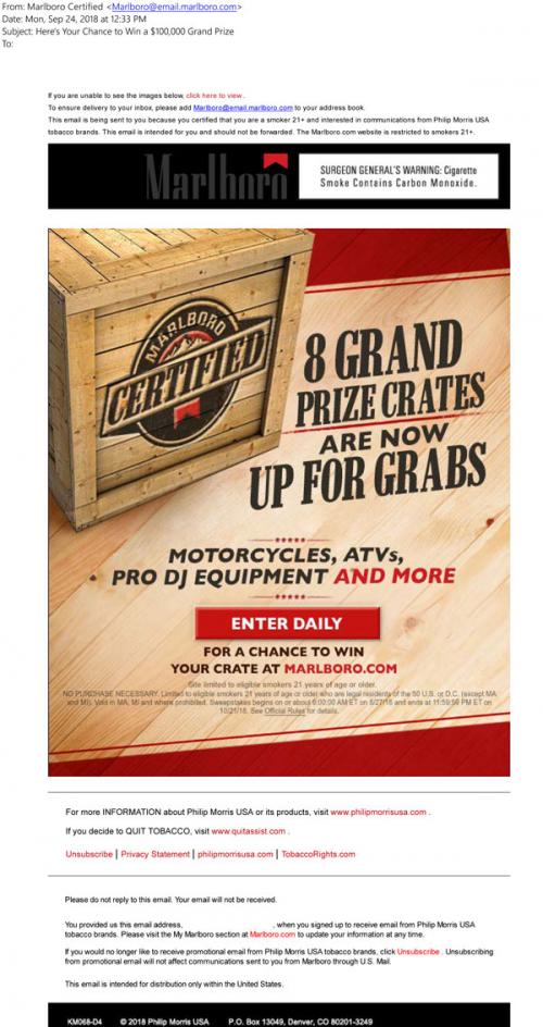 Email from Marlboro in September 2018 with a reminder to enter daily to win in the Marlboro Certified sweepstakes, on different themed prize crates. Links to the brand website to enter.
