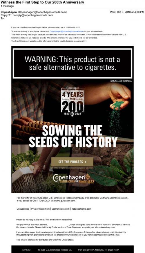 Email from Cophenhagen in October 2018 inviting the recipient to see the first step in the brand's 4 years to 200th anniversary with the planting of the tobacco seeds that will become product in those four years. Provides a link to the brand website.