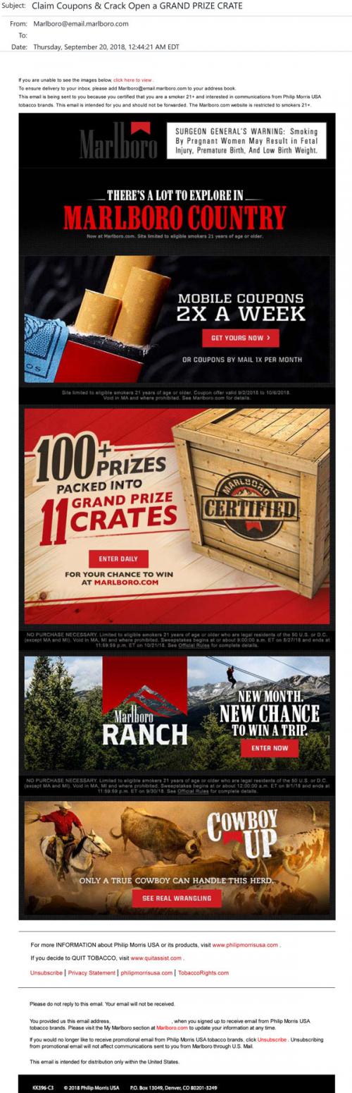 Email from Marlboro in September 2018 giving the option of claiming weekly mobile coupons or monthly direct mail coupons. Also promotes the Marlboro Certified sweepstakes and the chance to win a Marlboro Ranch trip, with links to enter. Includes a link to "see real wrangling" in the recent Cowboy Up feature.