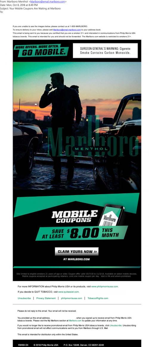 Email from Marlboro Menthol in October 2018 promoting the benefits of more coupons more frequently by claiming mobile coupons. Image shows some silhouettes of men smoking at dusk surrounded by classic convertibles.