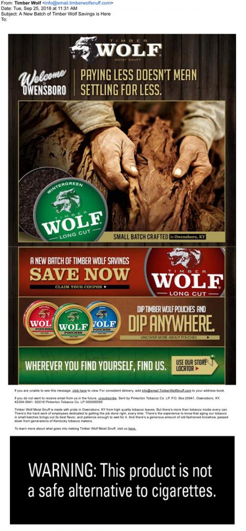 Email from Timber Wolf in September 2018 promoting coupons available on the brand website. Also links to learn more about their pouch products and use a store locator.