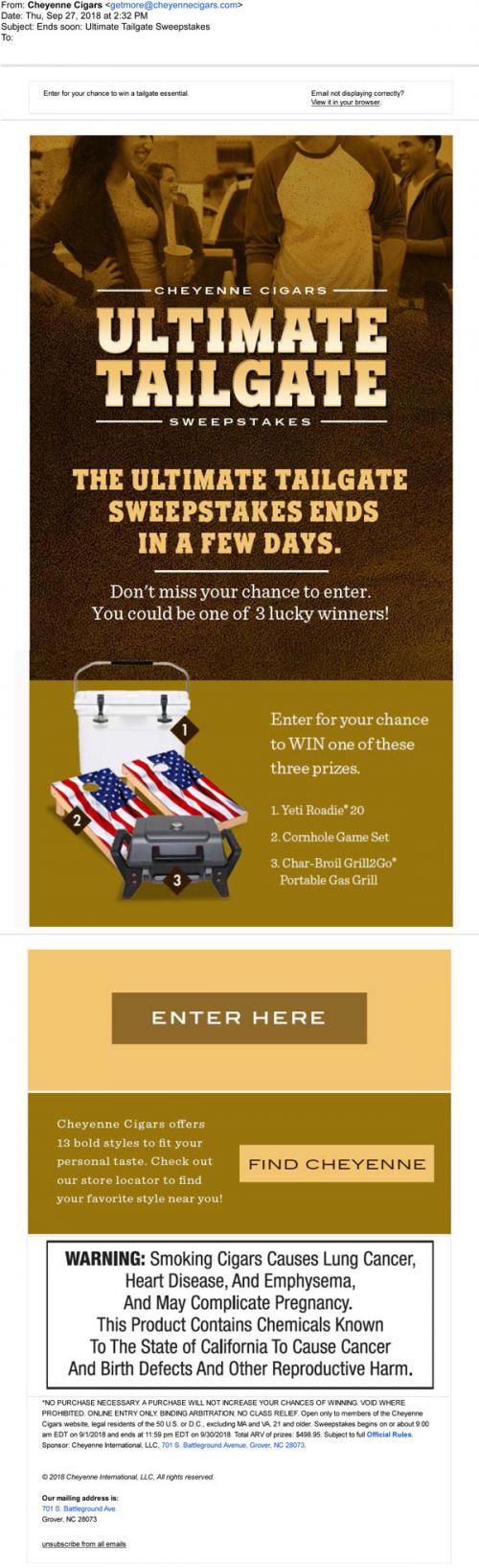 Email from Cheyenne Cigars promoting the final days of the Ultimate Tailgate sweepstakes, with a link to the brand website to enter. Also includes a link to use a store locator.