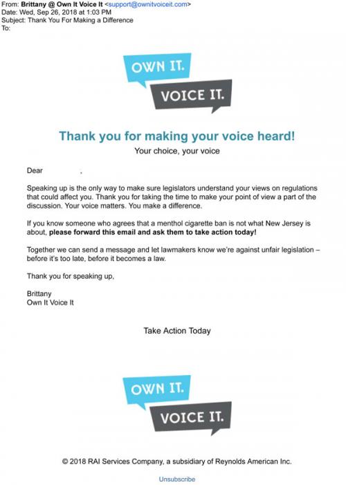 Email from the Own It, Voice It campaign in September 2018. Run by Reynolds American, the campaign is currently working to organize New Jersey citizens in the database to share their opinions with their legislators about the proposed menthol cigarette ban. Thanks the recipient for participating and asks them to forward the cause to concerned acquaintances.