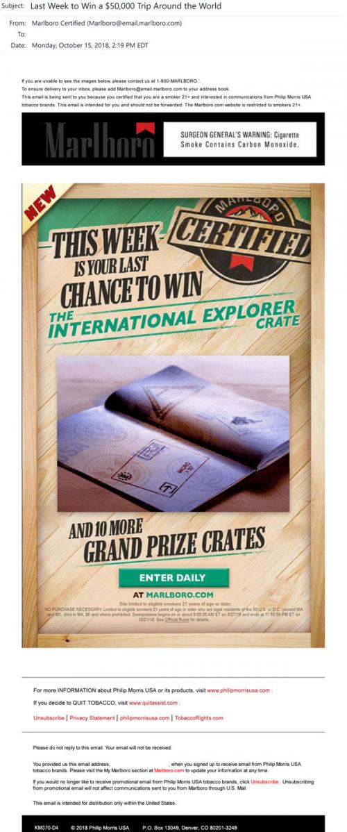 Email from Marlboro in October 2018 announcing the last week to enter the Marlboro Certified contest, highlighting the "international explorer" themed prize package crate. Provides a link to enter on the brand website.