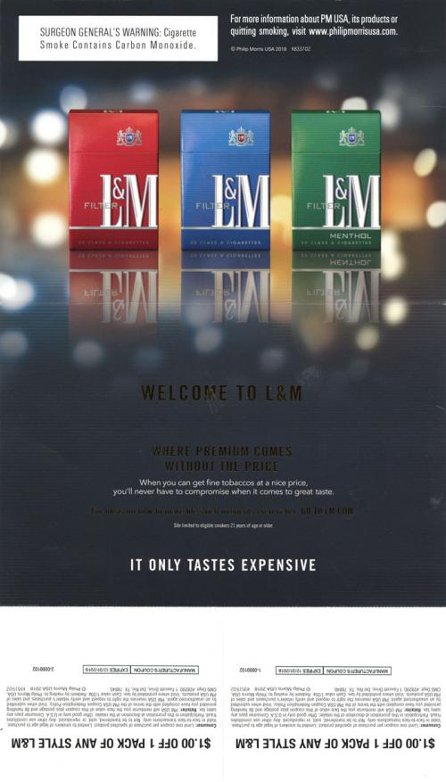 Direct mail from L&M received in October 2018, welcoming the customer to the brand. Delivers coupons.