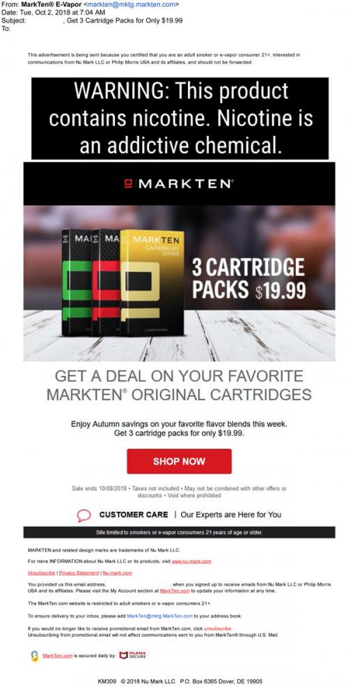 Email from MarkTen in October 2018 announcing a sale on cartridges of all flavor blends; provides a link to the brand website to shop.