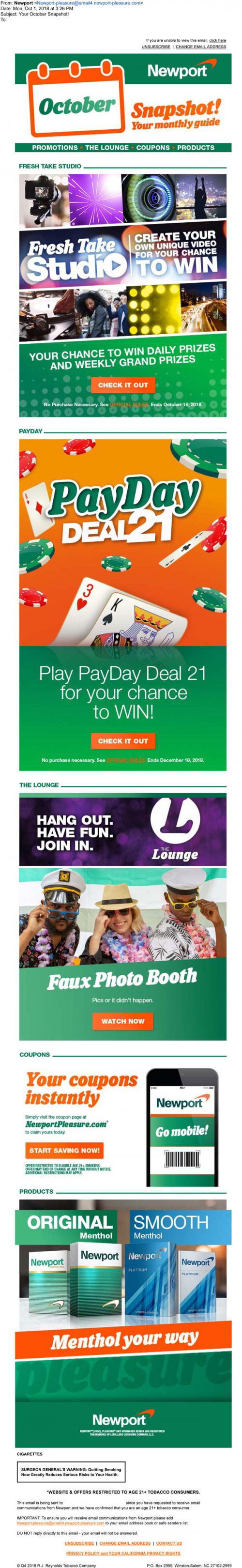 Email from Newport in October 2018 with a snapshot guide to what's happening on the brand website that month. Links to enter the Fresh Take Studio and play PayDay Deal 21, watch a video on the Lounge feature, and claim mobile coupons. Highlights their original and platinum menthol products.