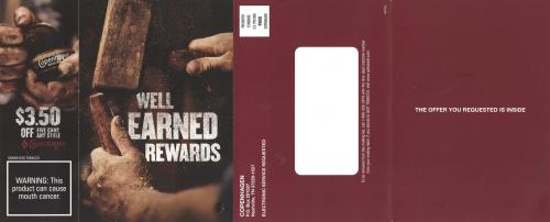 Direct mail from Copenhagen received in October 2018 that delivers a coupon and promotes claiming weekly mobile coupons through the brand website. Includes imagery of manly hands using a mallet and opening a can, as well as a mobile phone. Text: "Well earned rewards every. single. week."