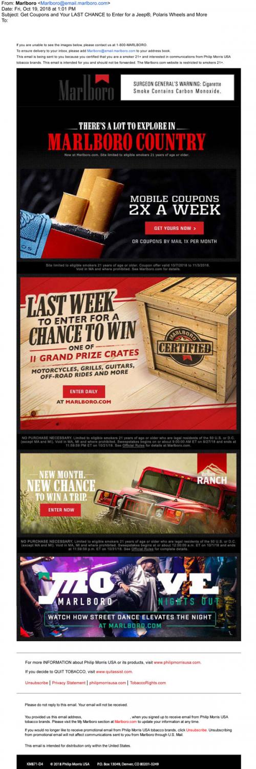 Email from Marlboro in October 2018 promoting both mobile and direct mail coupons, and the last week to enter the Marlboro Certified sweepstakes. Also provides a link to enter to win a trip to the Marlboro Ranch and to check out a Marlboro Menthol feature called Move about street dancing.