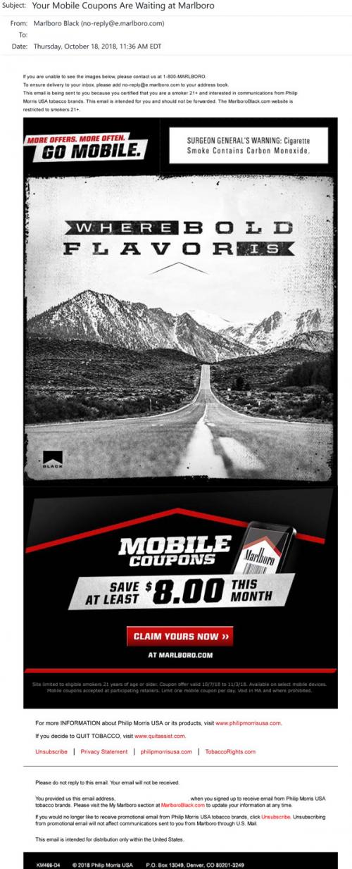 Marlboro Black email in October 2018 reminding the recipient to claim weekly mobile coupons. Image shows a mountain range and a wide stretch of open road.