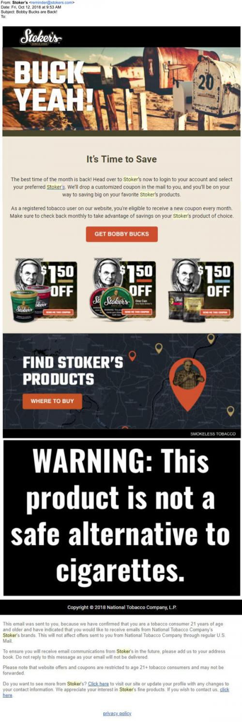 Email from Stoker's in October 2018 with an offer to receive direct mail coupons by claiming them through the brand website. Also links to use a store locator.
