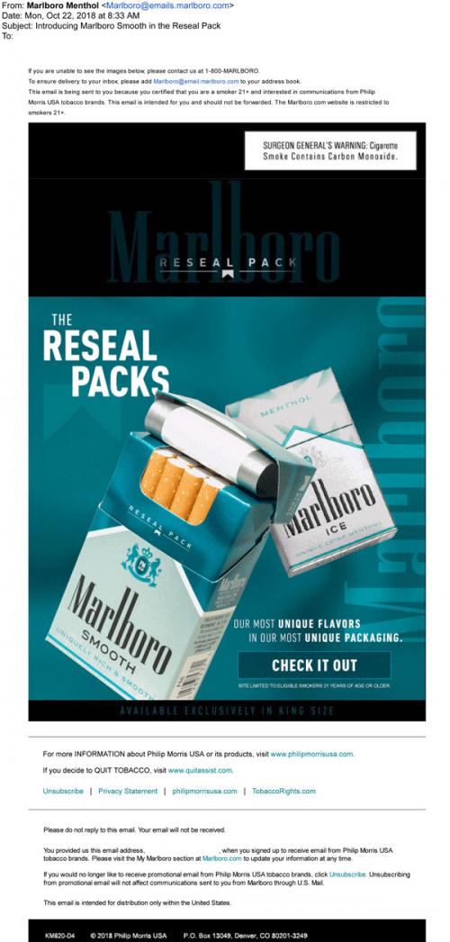 Email from Marlboro Menthol in October 2018 introducing smooth menthol in the new reseal packs, along with their menthol ice product. Provides a link to the brand website to learn more and has an animation of the pack opening to see it in action.