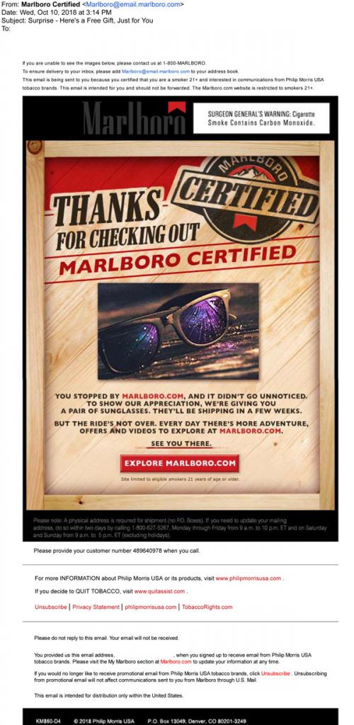 Email from Marlboro in October 2018 with a surprise notification that the recipient will get some sunglasses as a promotional gift for checking out the Marlboro Certified sweepstakes. Includes a reminder to explore more on the brand website.