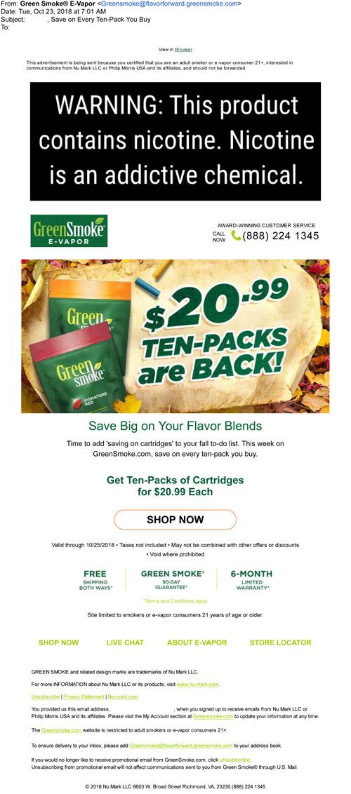 Email from Green Smoke in October 2018 announcing a sale on flavor packs through the brand website.