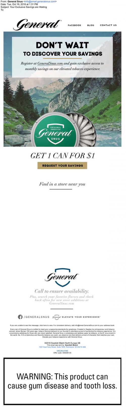 Email from General Snus in October 2018 inviting the recipient to register on the brand website to get access to monthly coupons. Provides a link to claim them and to use a store locator.