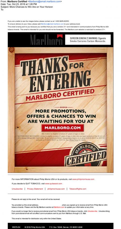 Email from Marlboro in October 2018 thanking the recipient for entering the Marlboro Certified sweepstakes, and reminds them to experience more future promotions on the brand website.
