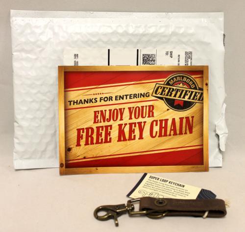 Direct mail gift sent by Marlboro in September 2018 of a leather keychain to promote the Marlboro Certified sweepstakes, as a thanks for entering. An included postcard reminds the recipient to check in at the brand website for more special offers. The gift arrived in a white bubble mailer.