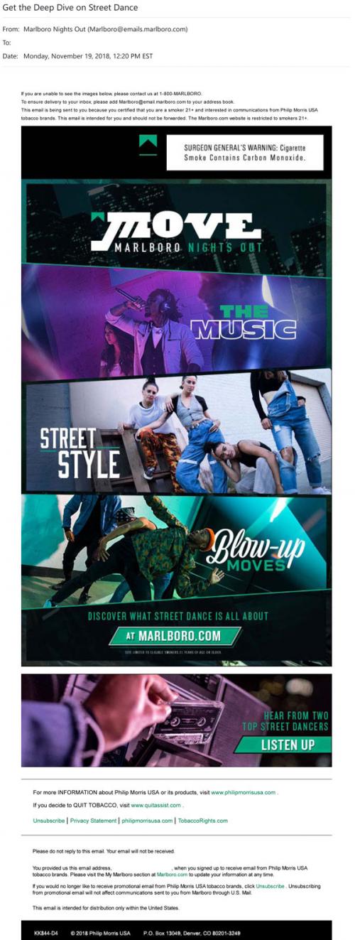 Email from Marlboro in November 2018 promoting the Move feature on Marlboro Nights Out that covers music, street style, and other street dance lifestyle aspects.