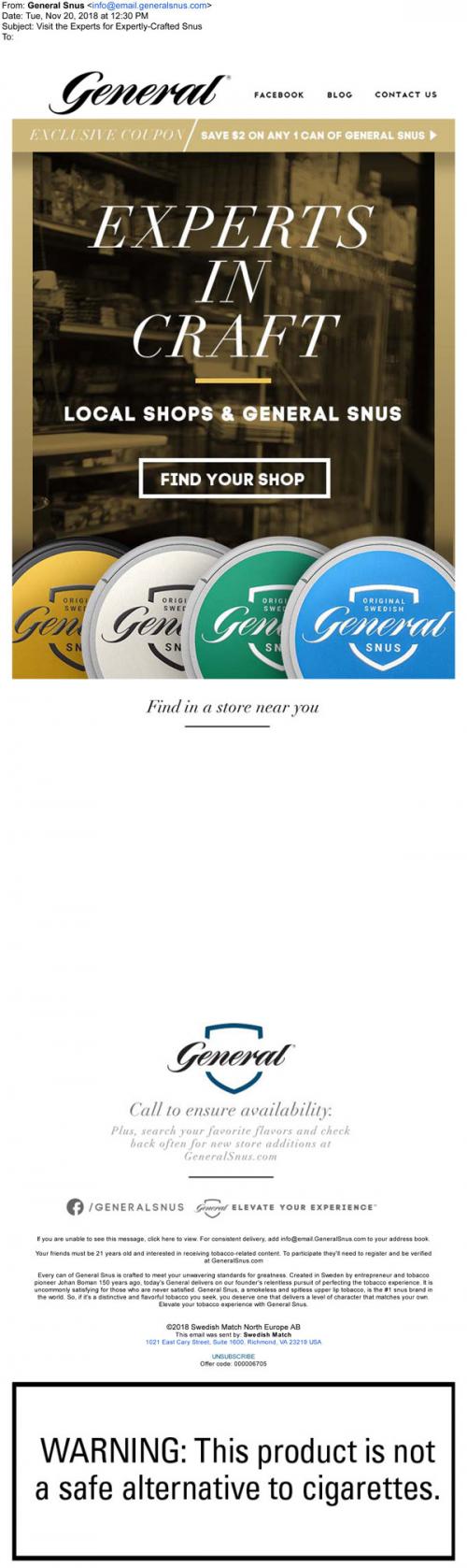 Email from General Snus in November 2018 that links to the brand website to claim coupons and use a store locator.