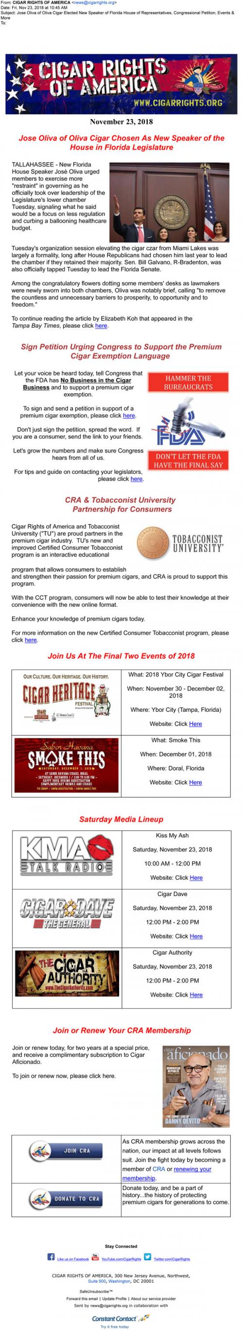 Email the Cigar Rights of America in November 2018 announcing cigar support news and providing a link to sign a petition to support a premium cigar exemption in FDA regulations. Promotes a co-sponsored program with Tobacconist University to educate consumers about cigars they enjoy, as well as upcoming events and media. Solicits for donations and memberships.