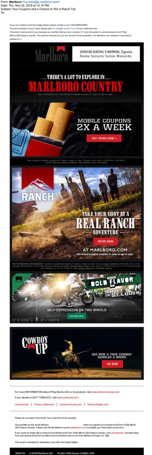 Marlboro email in November 2018 with links to claim mobile coupons on the brand website, enter to win a trip to the Marlboro Ranch, check out a feature on street bikes, and learn about bronc busting in Cowboy Up.