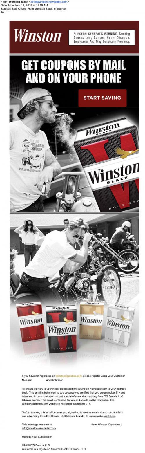 Email from Winston in November 2018 promoting mobile and direct mail coupons, with focus on their newest Winston Black product. Imagery features men smoking on bikes.