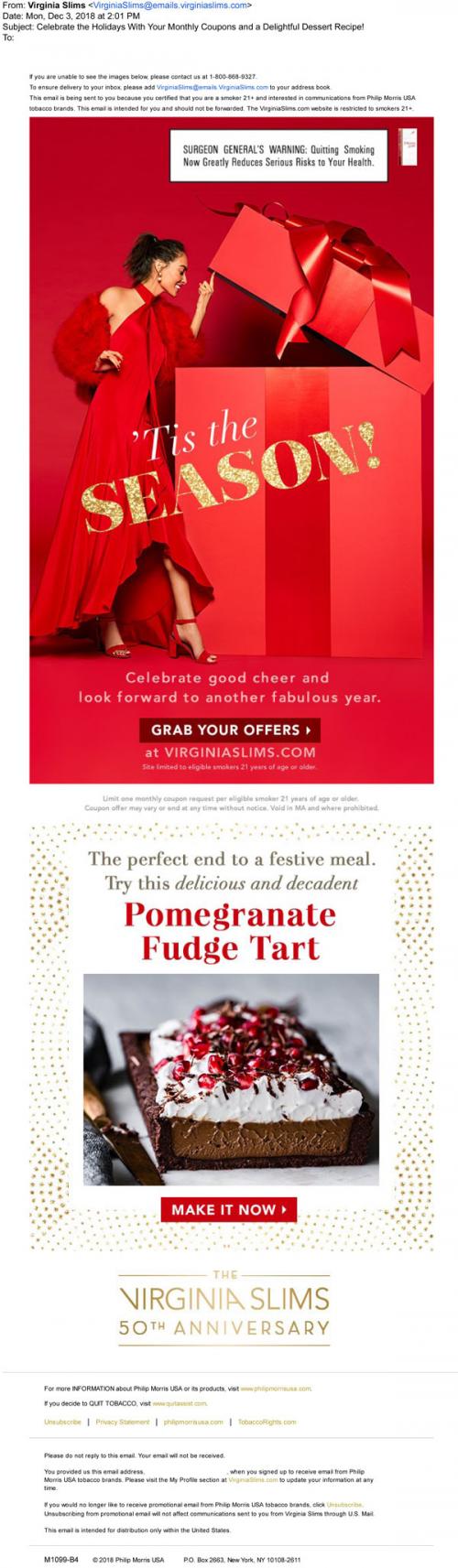 Virginia Slims email in November 2018 inviting the recipient to celebrate the holidays with their monthly coupon offer and a dessert recipe.