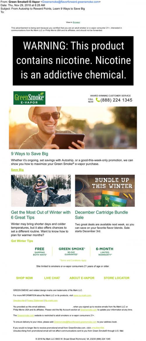 Green Smoke email in November 2018 with tips to save and survive the winter months, as well as announcing an upcoming bundle sale through the brand website.