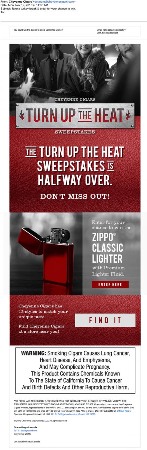 Cigars in November 2018 promoting the Turn Up the Heat sweepstakes, with a