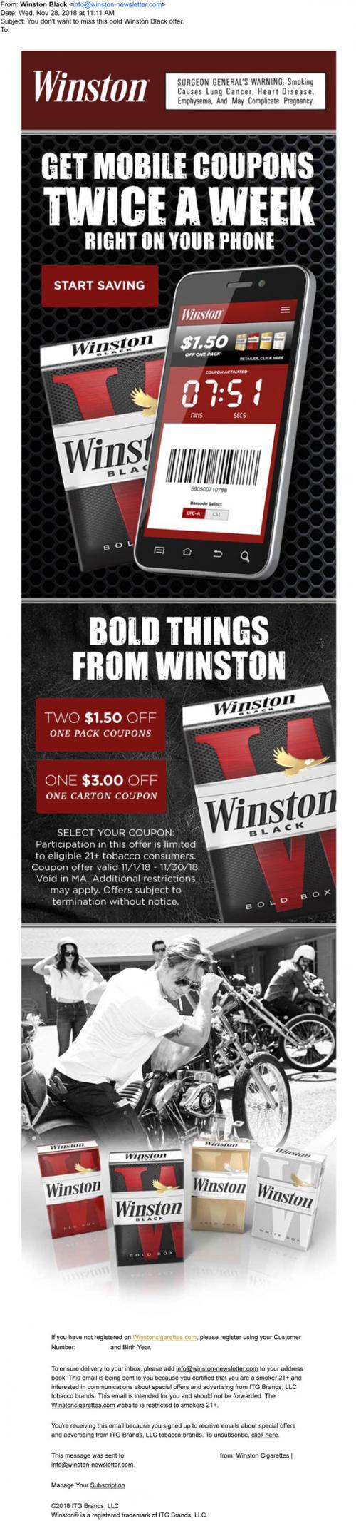 Email from Winston in November 2018 promoting mobile coupons and the Winston Black cigarettes.
