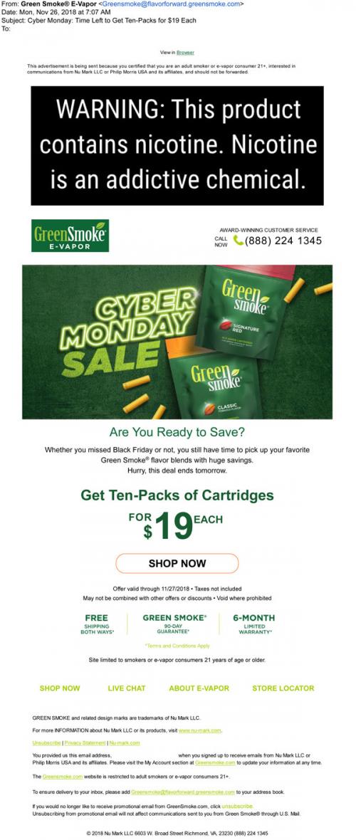 Green Smoke email in November 2018 with a Cyber Monday promotion on cartridges bought through the brand website.