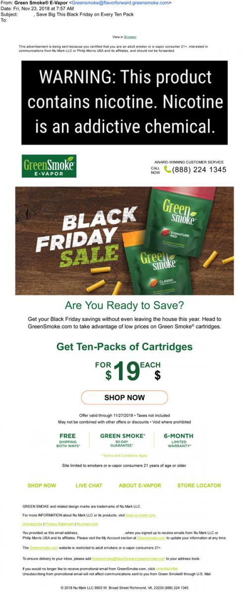 Green Smoke email in November 2018 promoting a Black Friday sale on cartridges purchased through the brand website.