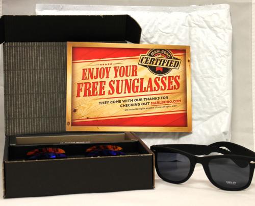 Direct mail gift received from Marlboro in November 2018 as part of the Marlboro Certified sweepstakes. The sunglasses and lenses came in a black box wrapped with a white bubble mailer, and included a card thanking the recipient for checking out the brand website, with a reminder to come back for coupons and more special offers.