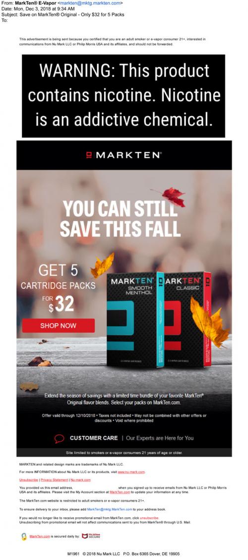 Email from MarkTen in December 2018 promoting a fall sale on cartridges bought through the brand website.