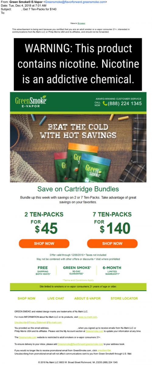 Green Smoke email in December 2018 promoting a sale on cartridge bundles to beat the oncoming winter with "hot savings."