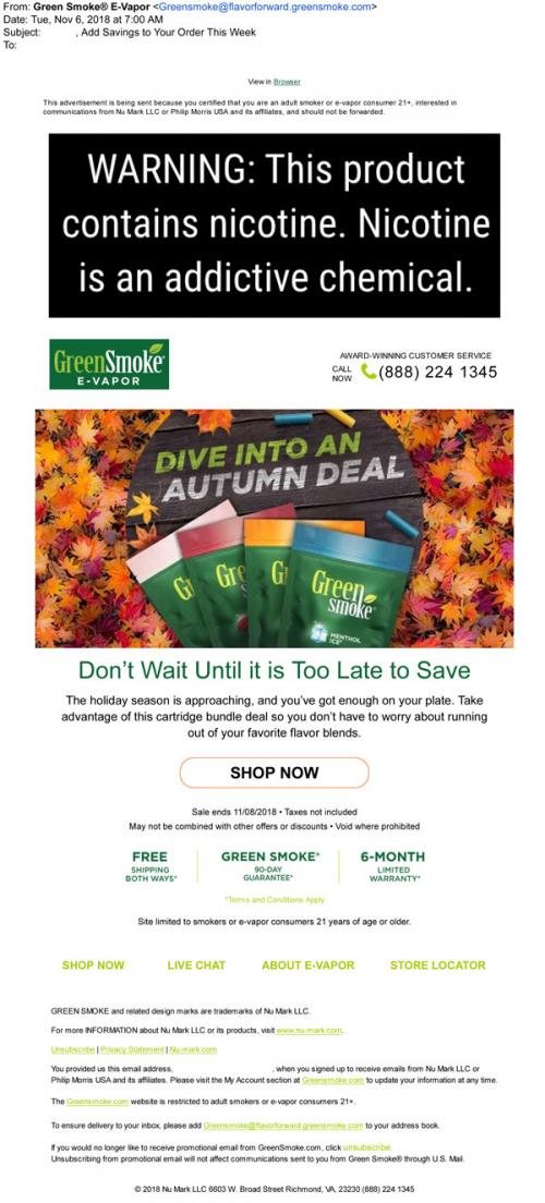 Email from Green Smoke in November 2018 promoting a fall sale on cartridge bundles.