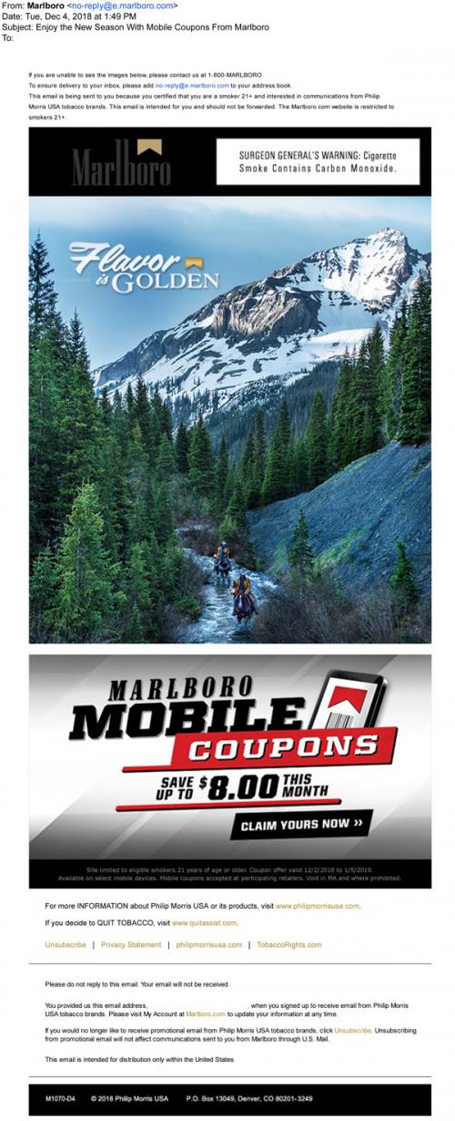 Email from Marlboro Gold in December 2018 reminding the recipient to claim mobile coupons.