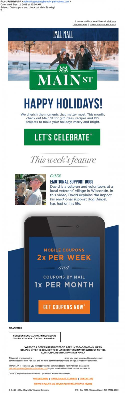 Email from Pall Mall in December 2018 wishing the recipient a happy holidays, with a link to check out the Main St feature for gift ideas and recipes for the season. Also promotes a cause to support dogs for veterans and the availability of weekly mobile coupons.