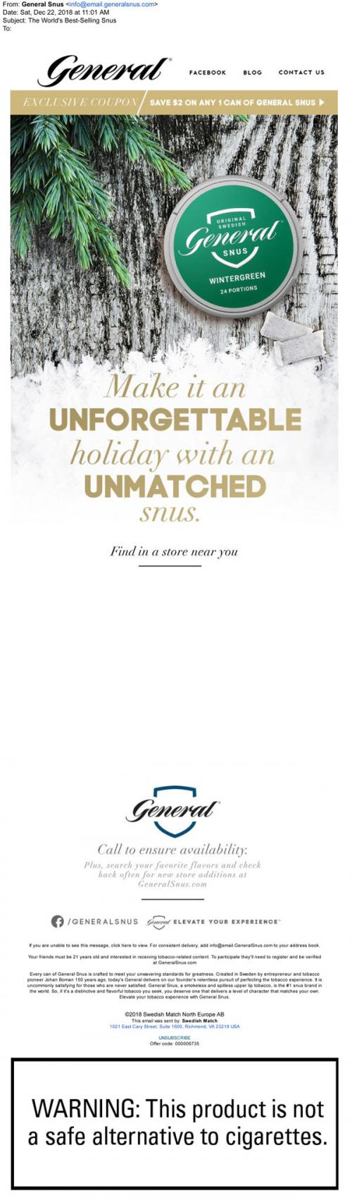 Email from General Snus in December 2018 inviting the recipient to share the holidays with their products. Links to the brand website to claim a coupon and to use a store locator.
