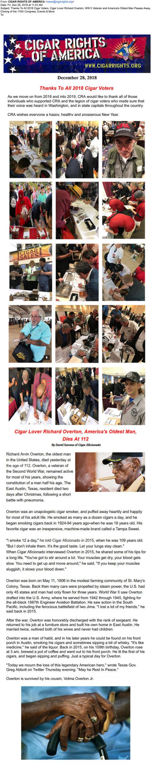 Email from the Cigar Rights of America in December 2018 thanking all of their supporters and wishing everyone a happy New Year. Has a bunch of photos of people from CRA events and celebrates the death of America's oldest man, an ardent cigar supporter. Reminds the recipient to follow CRA on social media and promotes upcoming events and media. Also solicits for donations and memberships.