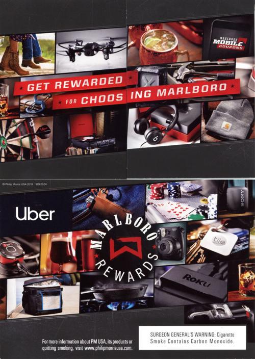 Direct mail received from Marlboro in January 2019 describing the new Marlboro rewards program, with instructions on how to claim points from specially marked packs and that more points can be earned online. Promises bonus points for signing up. Includes images of various prizes that will be offered. Includes coupons.