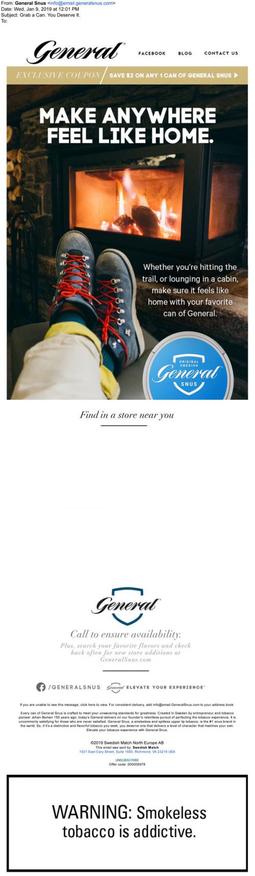 Email from General Snus in January 2019 linking to a coupon to claim on the brand website and listing several nearby retail locations.