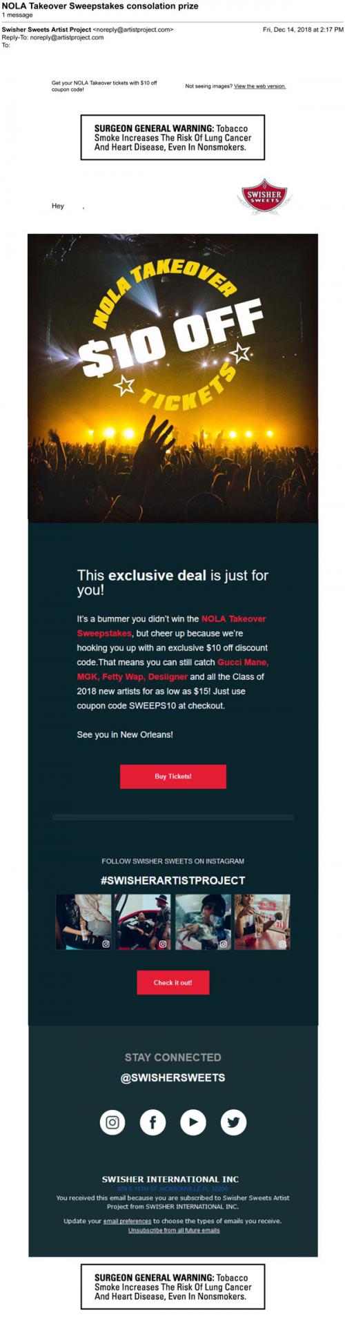 Email from Swisher in December 2018 with a discount code as a consolation for not winning the NoLa Takeover sweepstakes. Also promotes the brand on Instagram and other social media platforms.