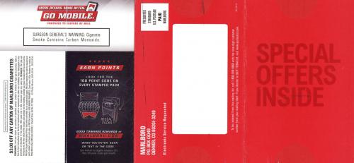 Direct mail booklet from Marlboro received in February 2019 that promotes Marlboro Rewards and how to collect points on packs and online. Includes a coupon and a reminder to claim mobile coupons. Thanks the recipient for choosing Marlboro.