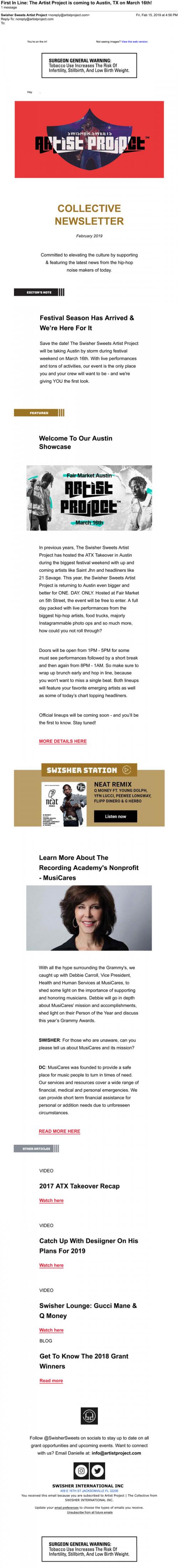 Email from Swisher with a newsletter for February 2019 about what's happening with the Artist Project music scene. Describes upcoming events, links to an interview and videos to watch, and even a music stream on the brand website.