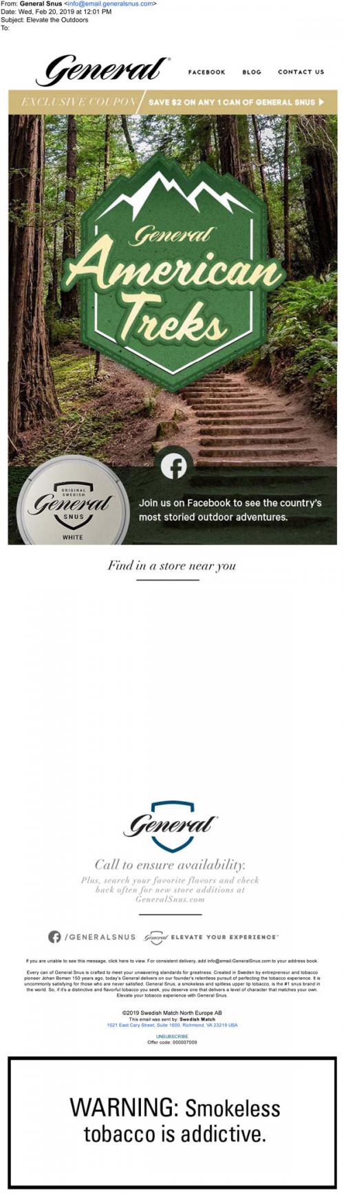 General Snus email in February 2019 promoting their Facebook page series on American Treks, outdoor adventures. Lists some nearby retail locations and provides a link to claim coupons from the brand website.