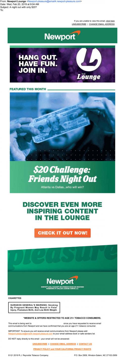 Newport email in February 2019 promoting content on the Lounge section of the brand website, specifically a 20$ "friends night out" challenge.